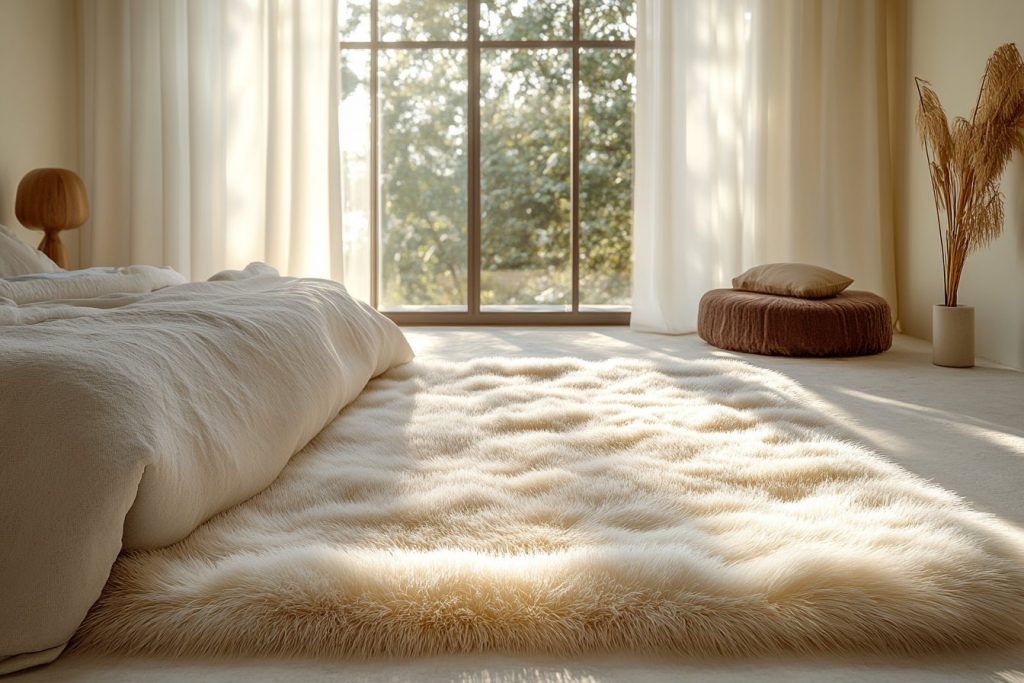 L’emplacement, quant à lui, joue un rôle crucial. Placez-le au centre de la pièce ou partiellement sous le lit pour obtenir un effet harmonieux. Assurez-vous qu’il y ait suffisamment de surface antidérapante pour éviter les accidents domestiques. Vous pouvez même ajouter un sous-tapis pour renforcer cette caractéristique.